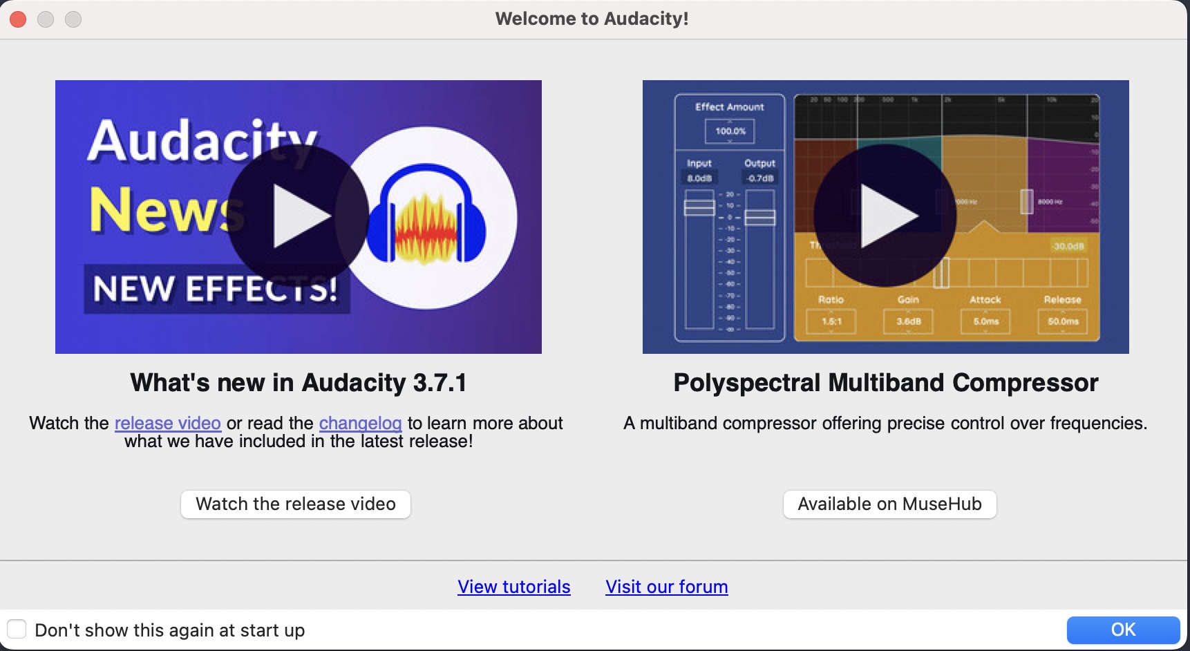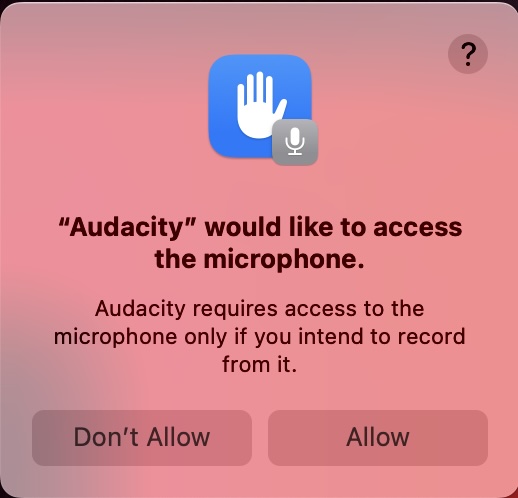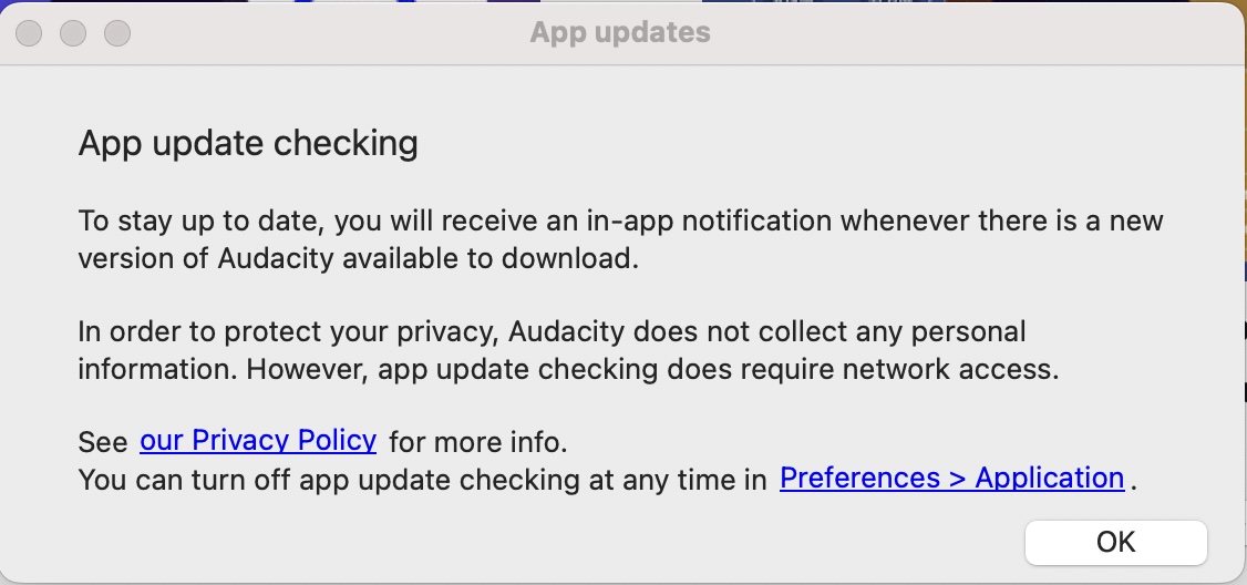 When using Audacity for the first time, a few dialog boxes will appear that you can click past. The screenshots below come from a first-time use of the Audacity app on one of the Mac workstations in the Amaranth Studio.