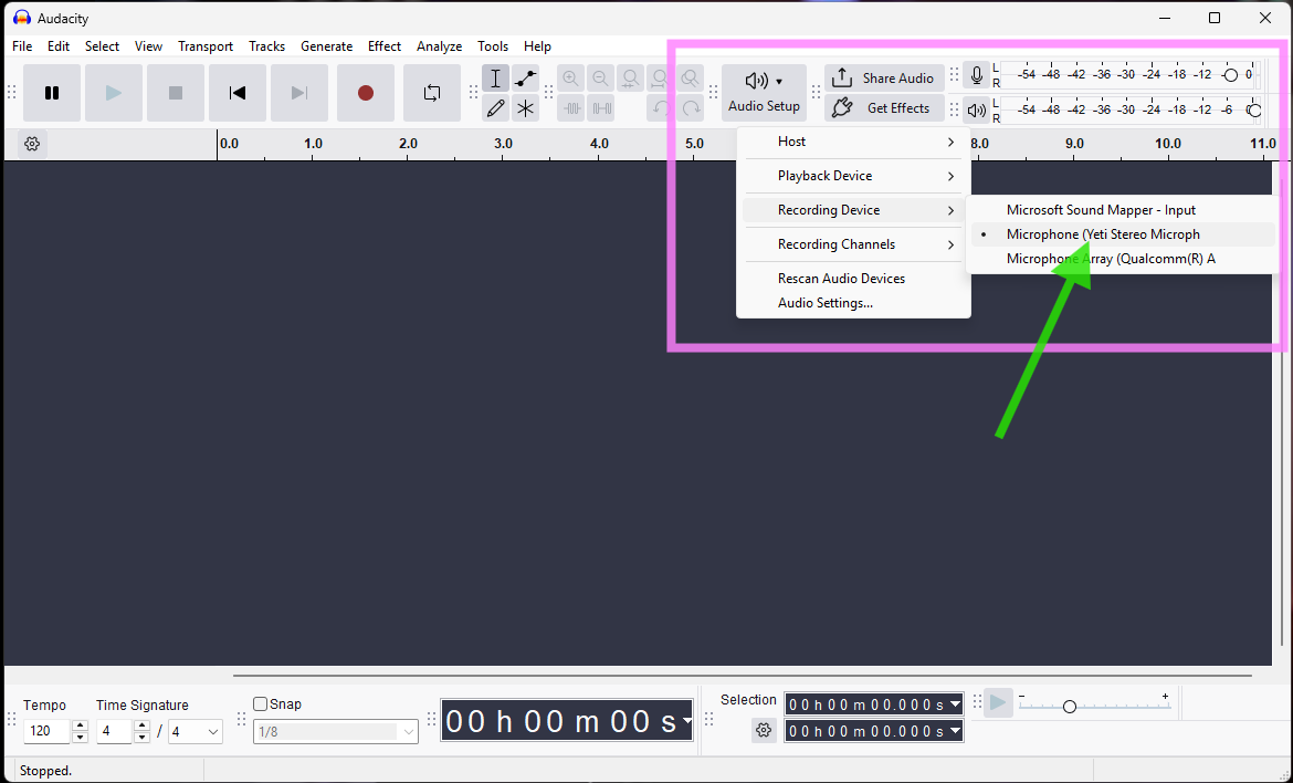 Check that the YETI mic as the recording input device is correctly connected by clicking on the Audio Setup button in the top row of controls